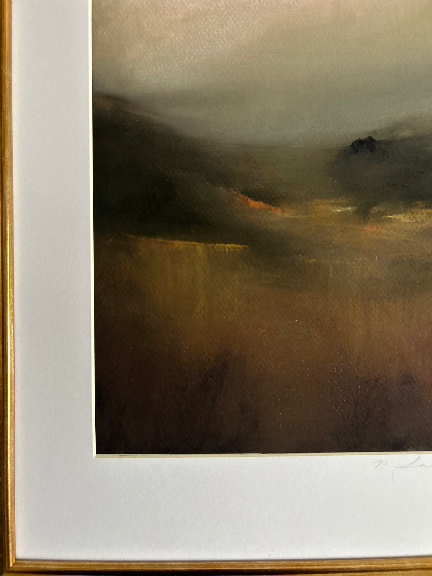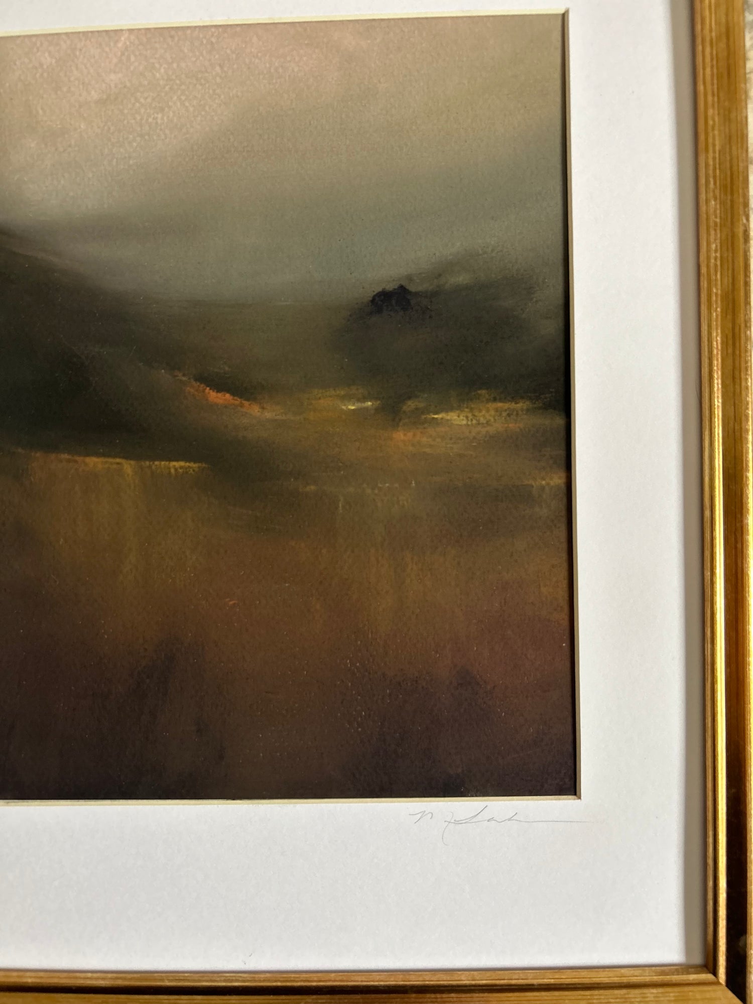 This 8x10 soft oil pastel on 160g rag paper. Features a fall color palette of rust, brown, and light pink. Framed in an 12x15 faux antique-gold frame.