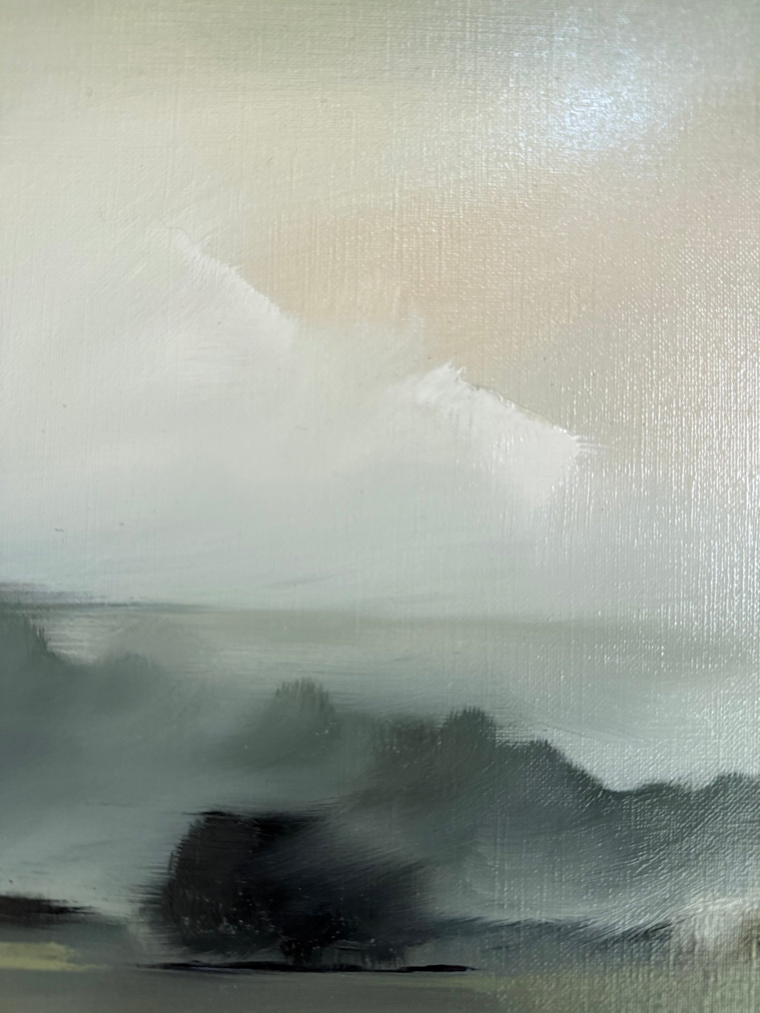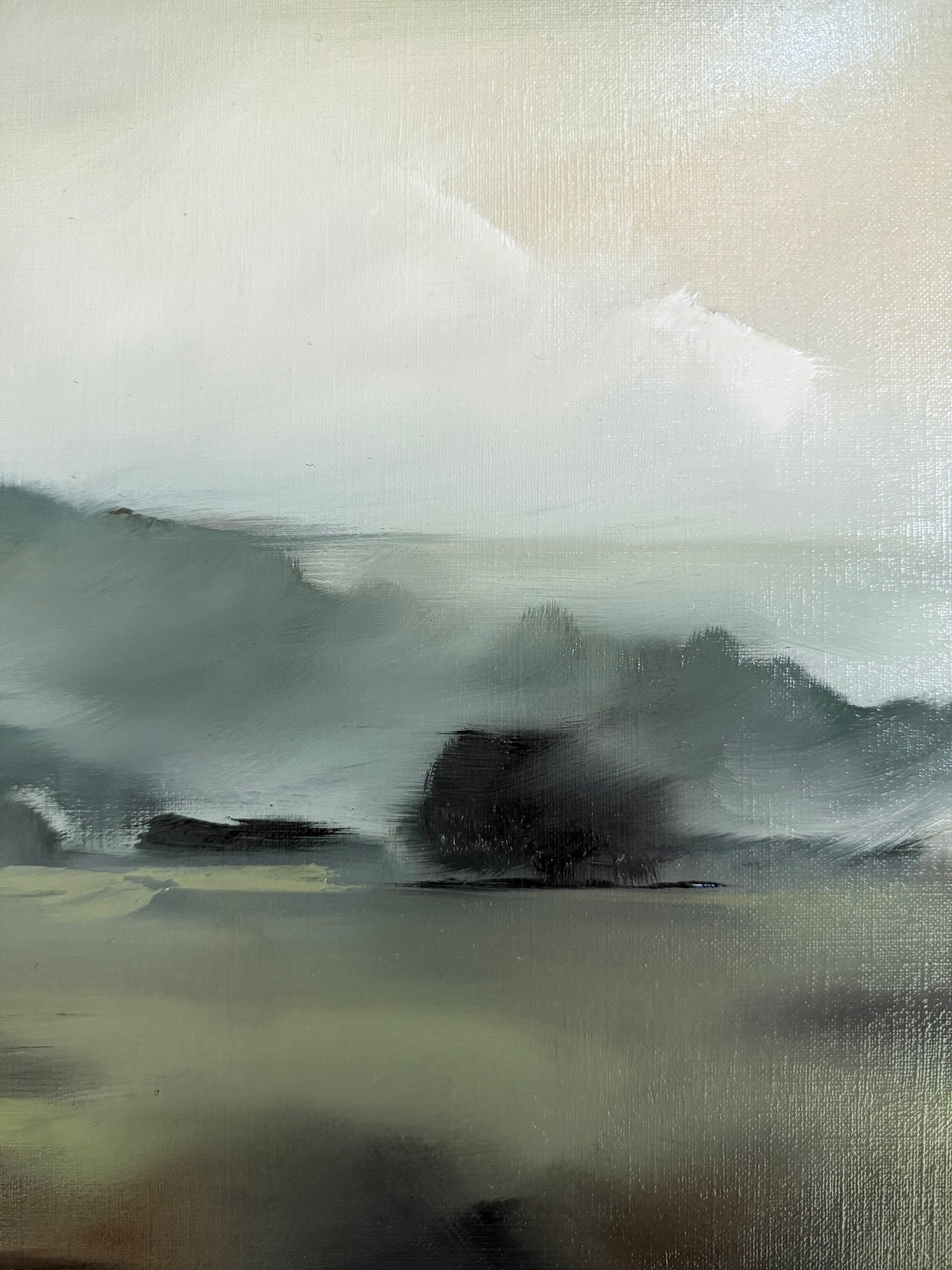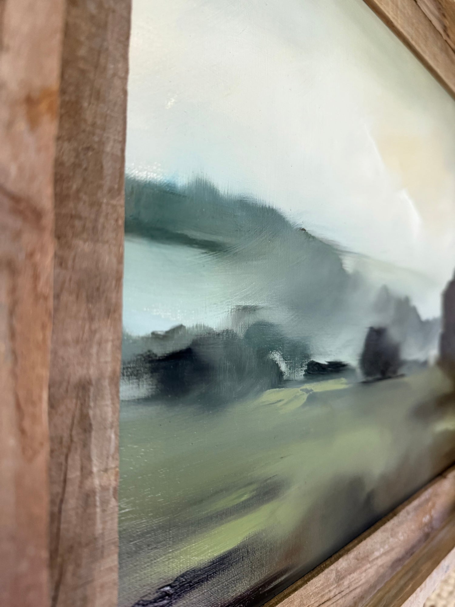 This 16x12 inch oil painting on cotton canvas panel captures a dreamy stretch of English countryside, with soft sage and olive green pastures unfolding beneath a pale creamy sky.
