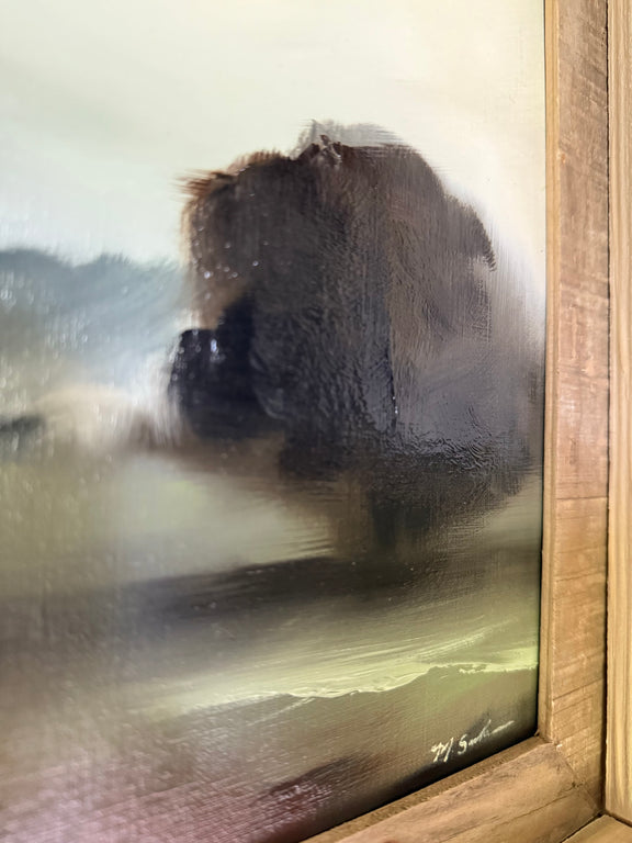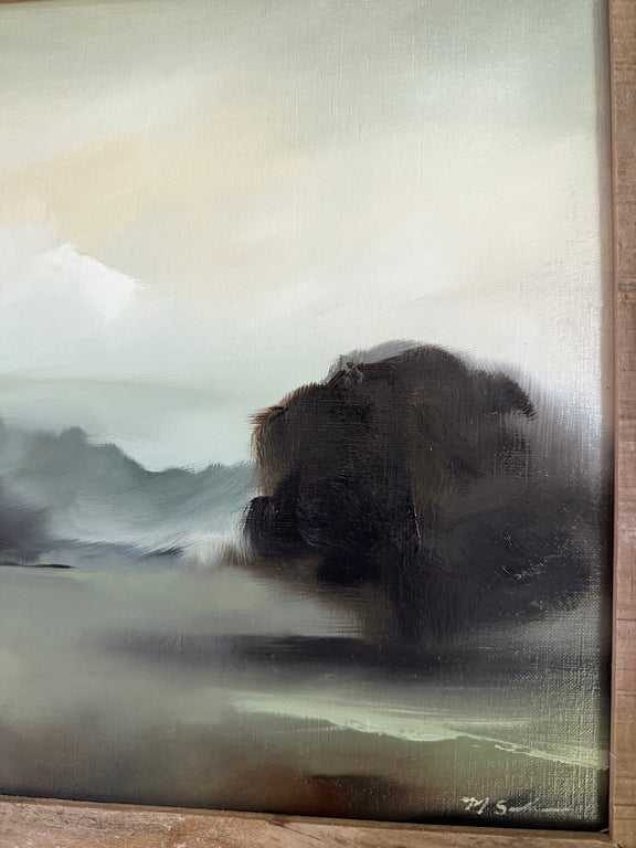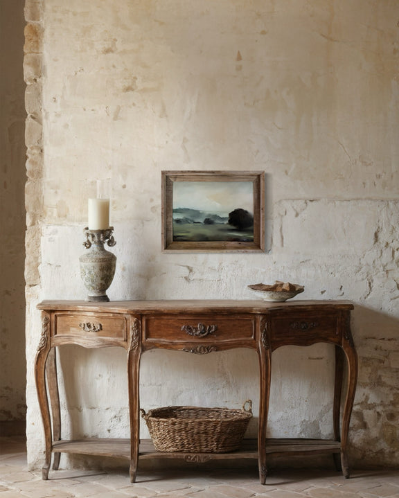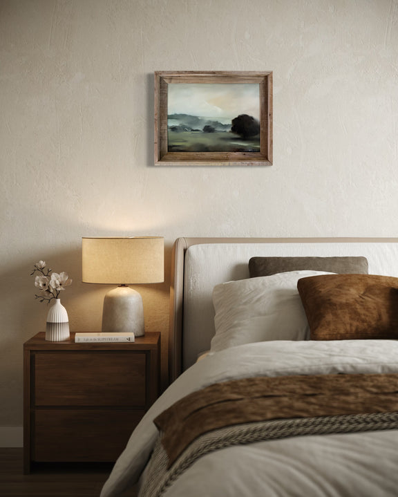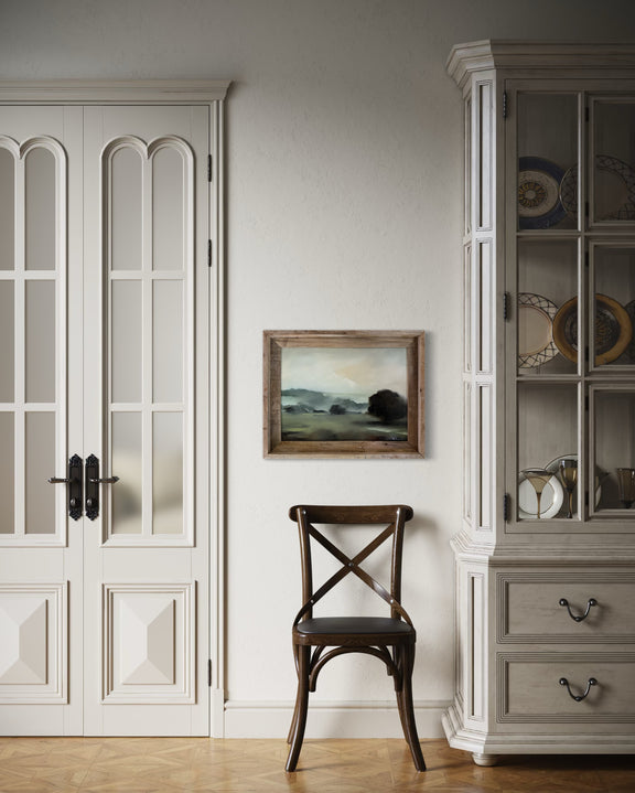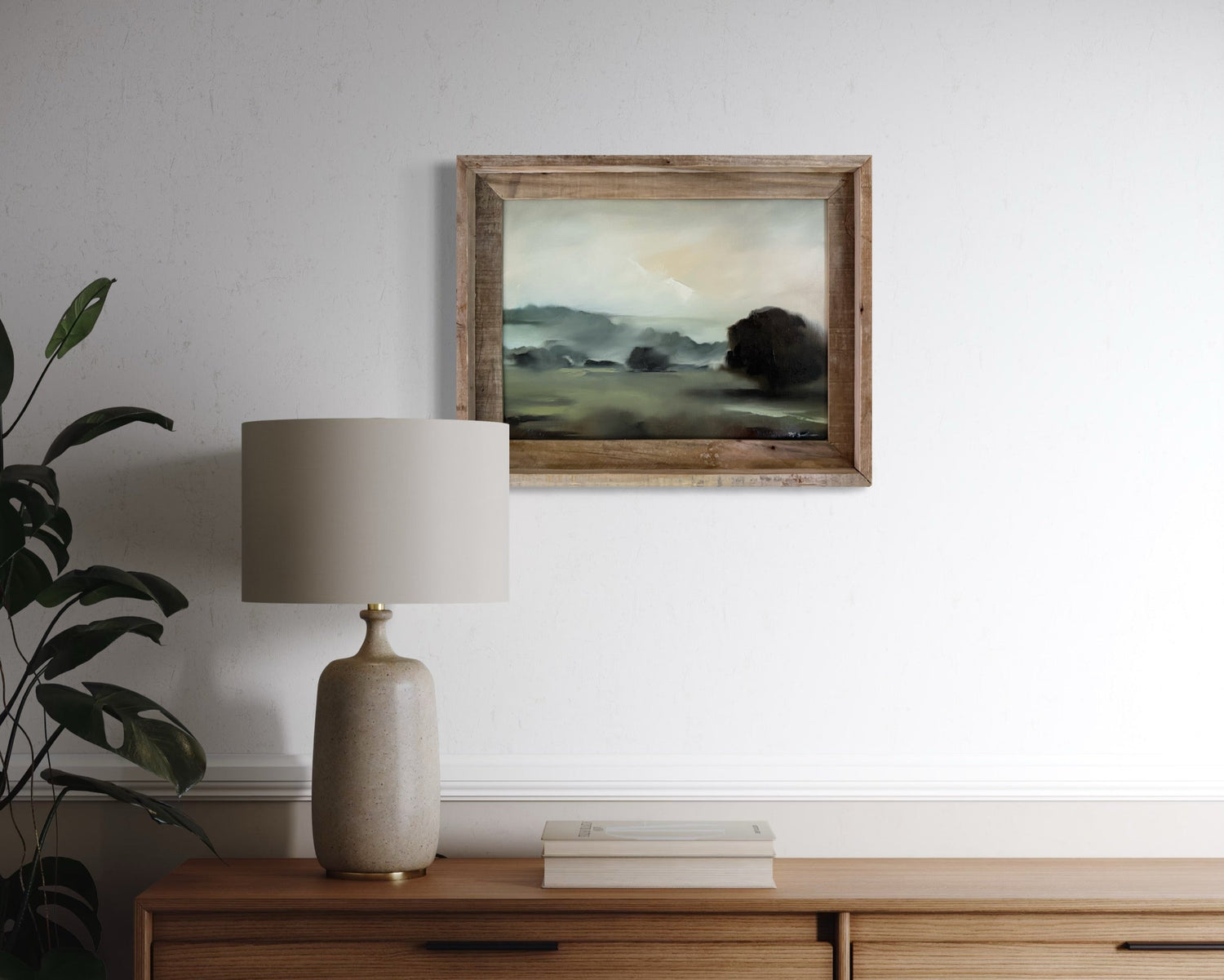 Framed in a weathered-style barn-wood frame, the piece has a warm, rustic feel that enhances its natural tones and timeless subject. The frame’s textured, aged finish pairs seamlessly with the softness of the landscape, making it a fitting addition to both cozy interiors and more refined spaces.