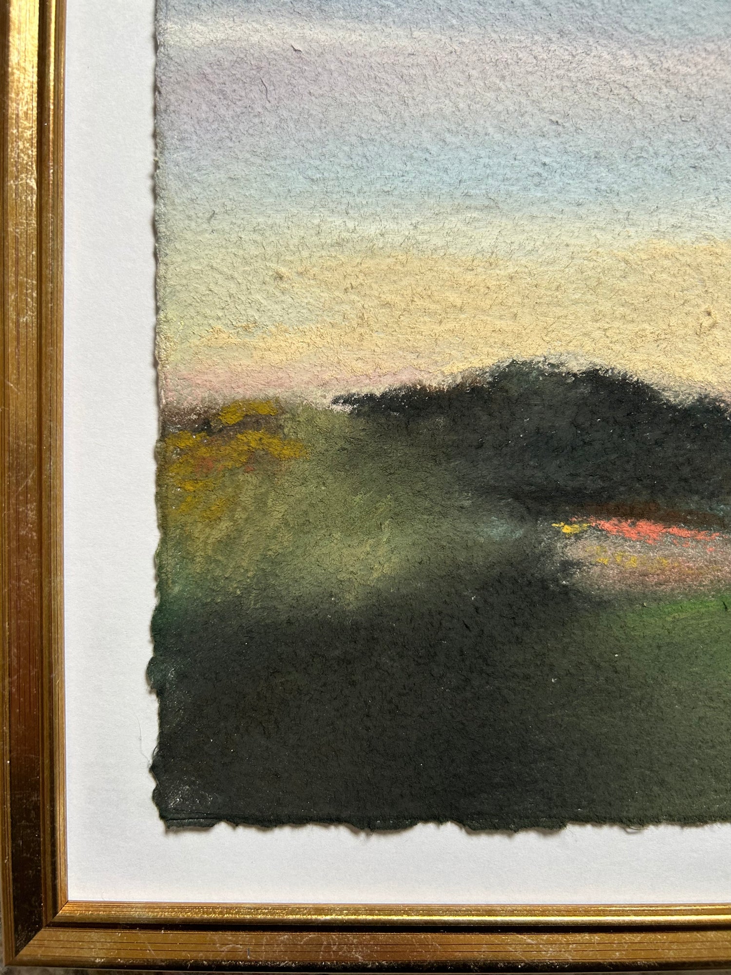 A 9x12 soft oil pastel on handmade cold press water color paper. Features a vibrant pallet of green, yellow, blue, white, and pink.