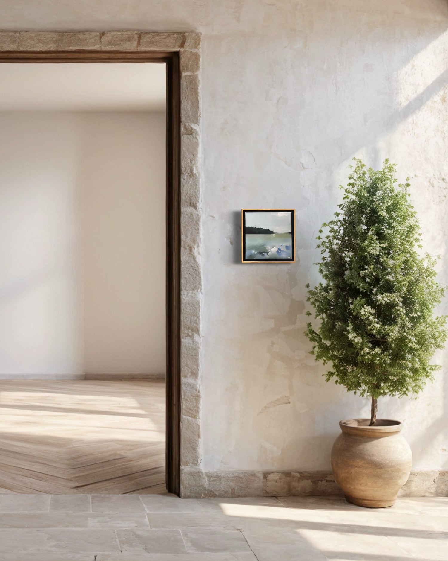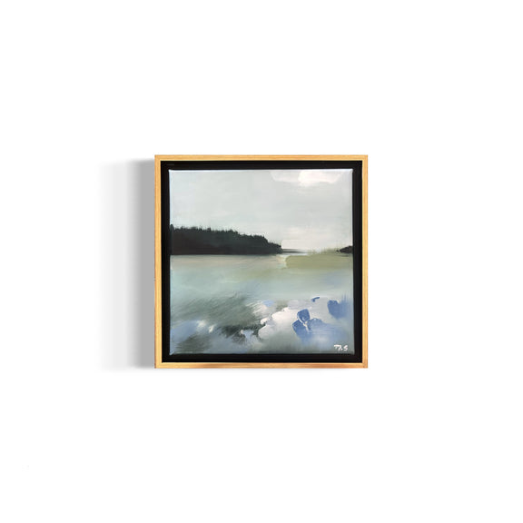 A neutral 10"x10" oil painting featuring small amounts of texture on a .75 inch deep gallery-wrapped cotton canvas. Comes varnished with a satin finish, ready to hang in a black and antique gold float frame.
