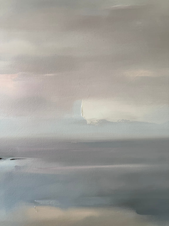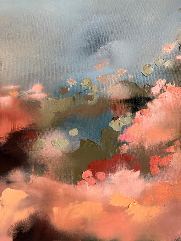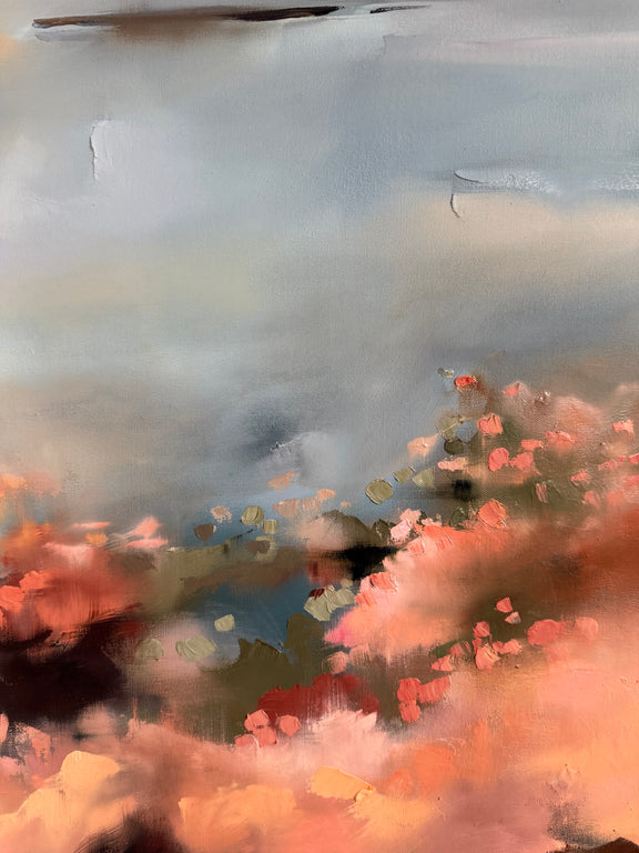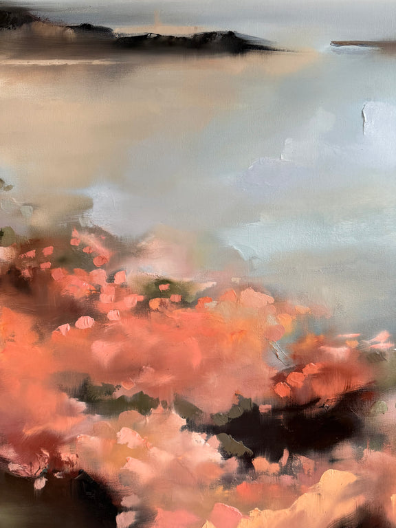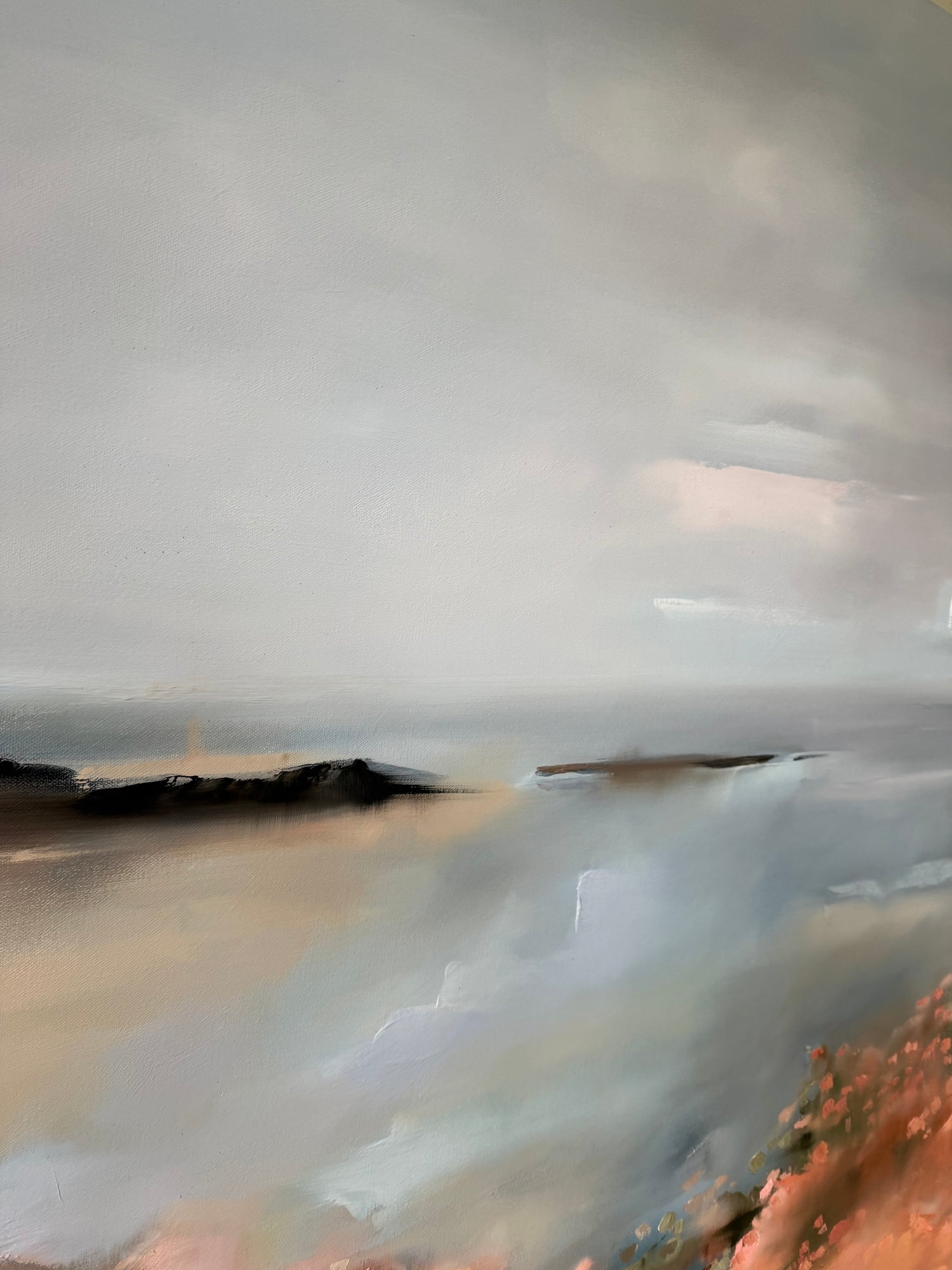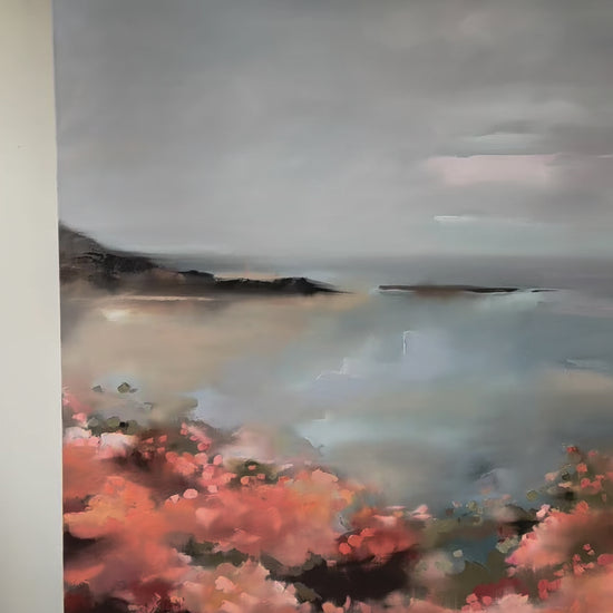 This 48x48” oil painting is a captivating fusion of rich corals and reds providing a dramatic foreground to the textural and moody pastel sky. Thickly applied strokes of color create a textured, almost tactile effect, inviting the viewer to experience the romance of the California coast.