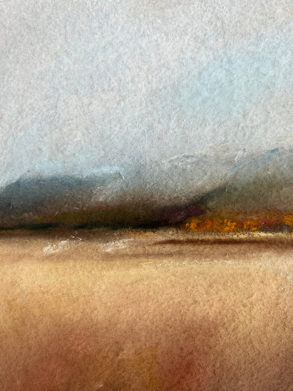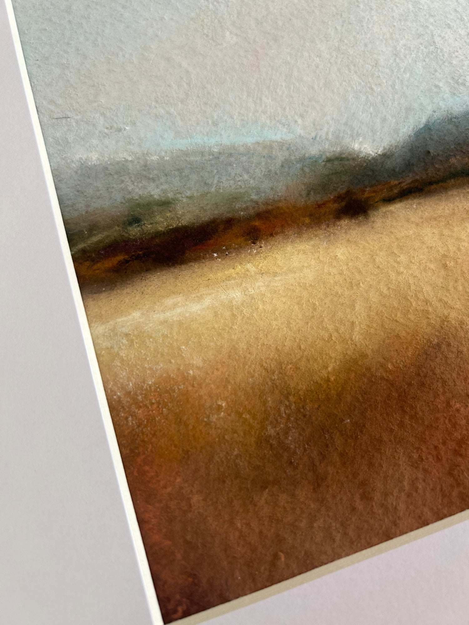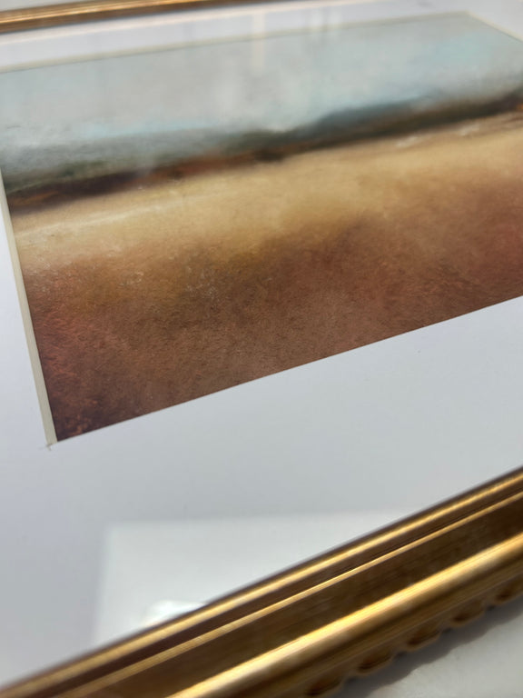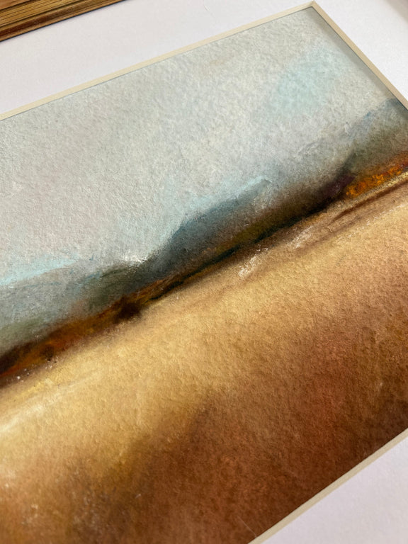 This 8x10 soft oil pastel on handmade cold press water color paper. Features a warm pallet of gold and brown with pops of light blue. Framed in an 12x15 faux antique gold frame.