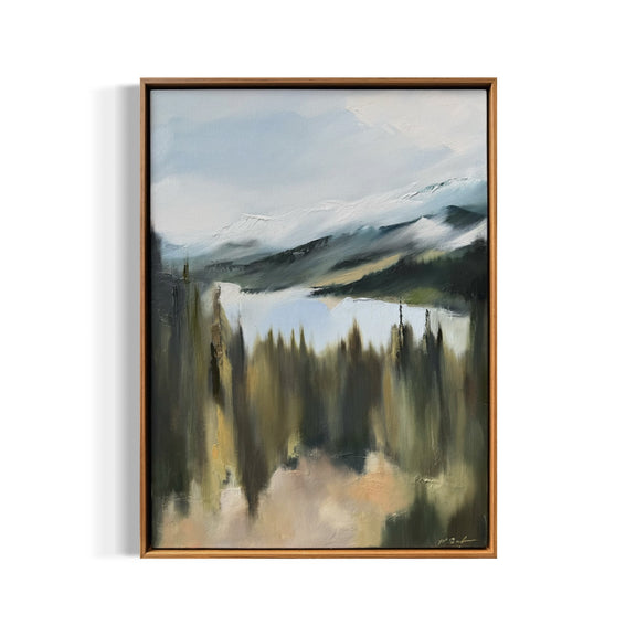 An 18x24" expressionist oil painting inspired by Colorado’s landscape. Lush green pines rise against the terrain while touches of ice-blue water weave through the scene. This textured brushwork and layered earth tones add depth and movement, creating a peaceful, nature-grounded focal point for any space.