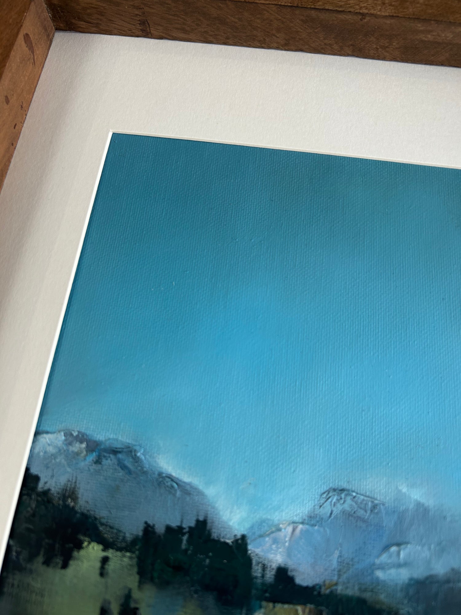 This 8x10 oil painting on canvas board features a palette of both bright and dark greens and blues. Inspired by Green River Lake in Wyoming.