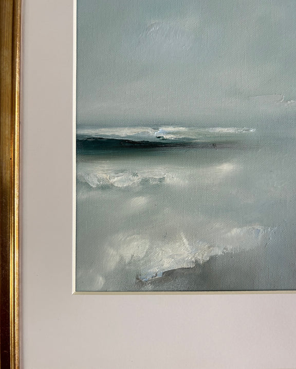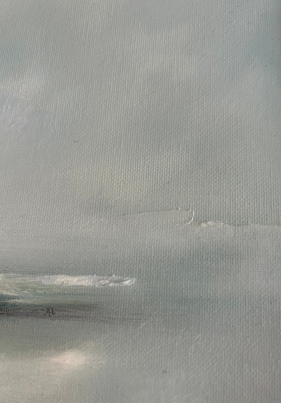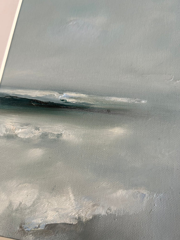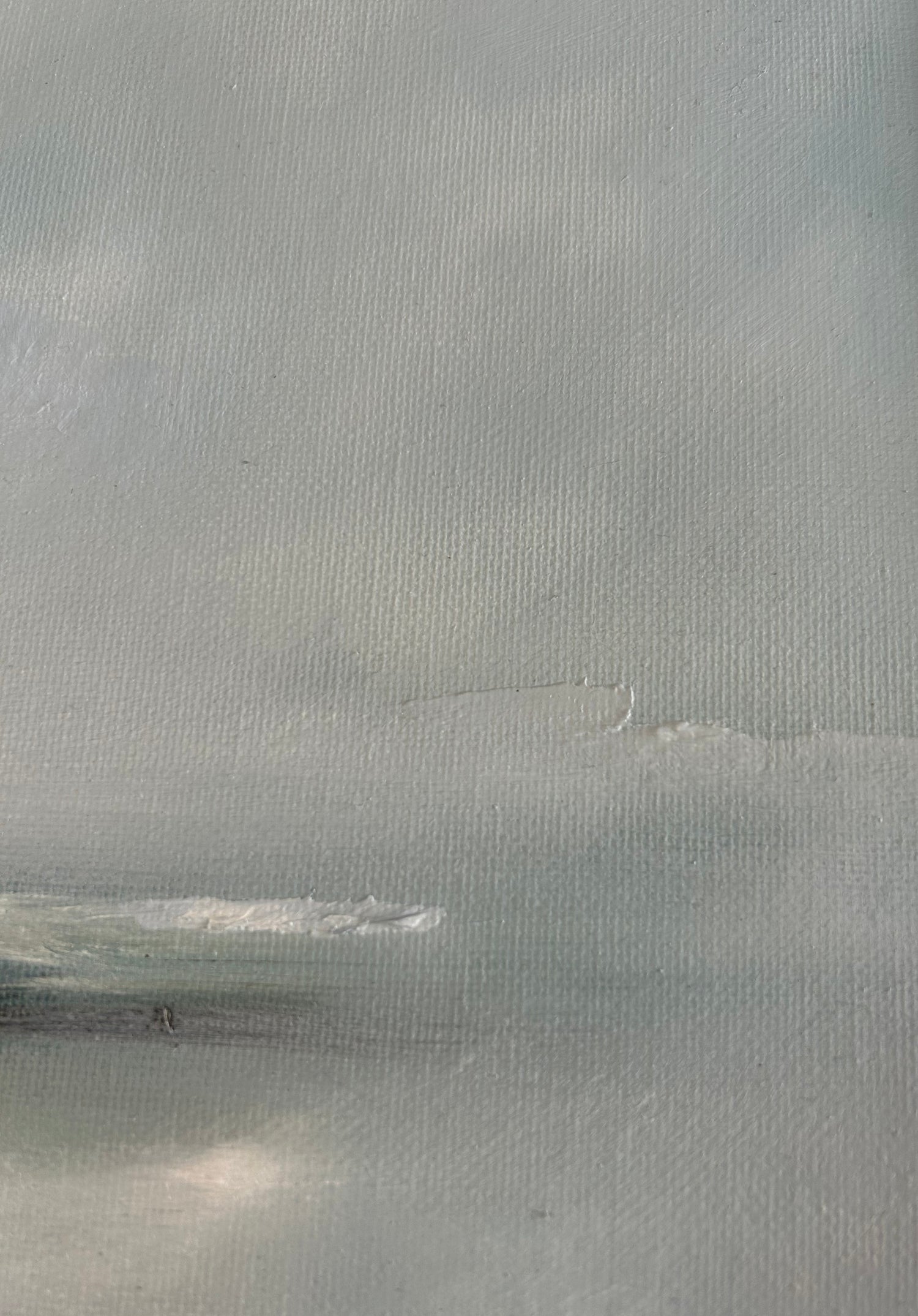 This 8x10 oil painting on canvas board features a palette of cool whites, blues, and grays, accented with pops of dark blue and teal.