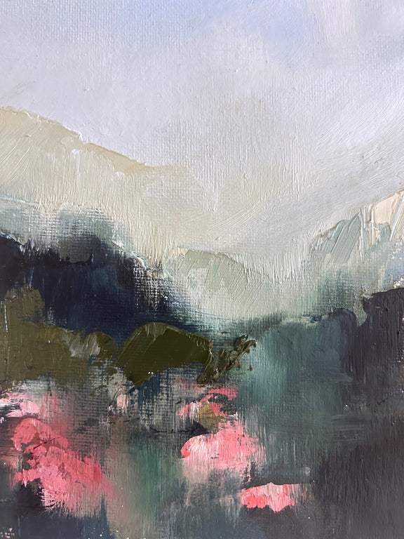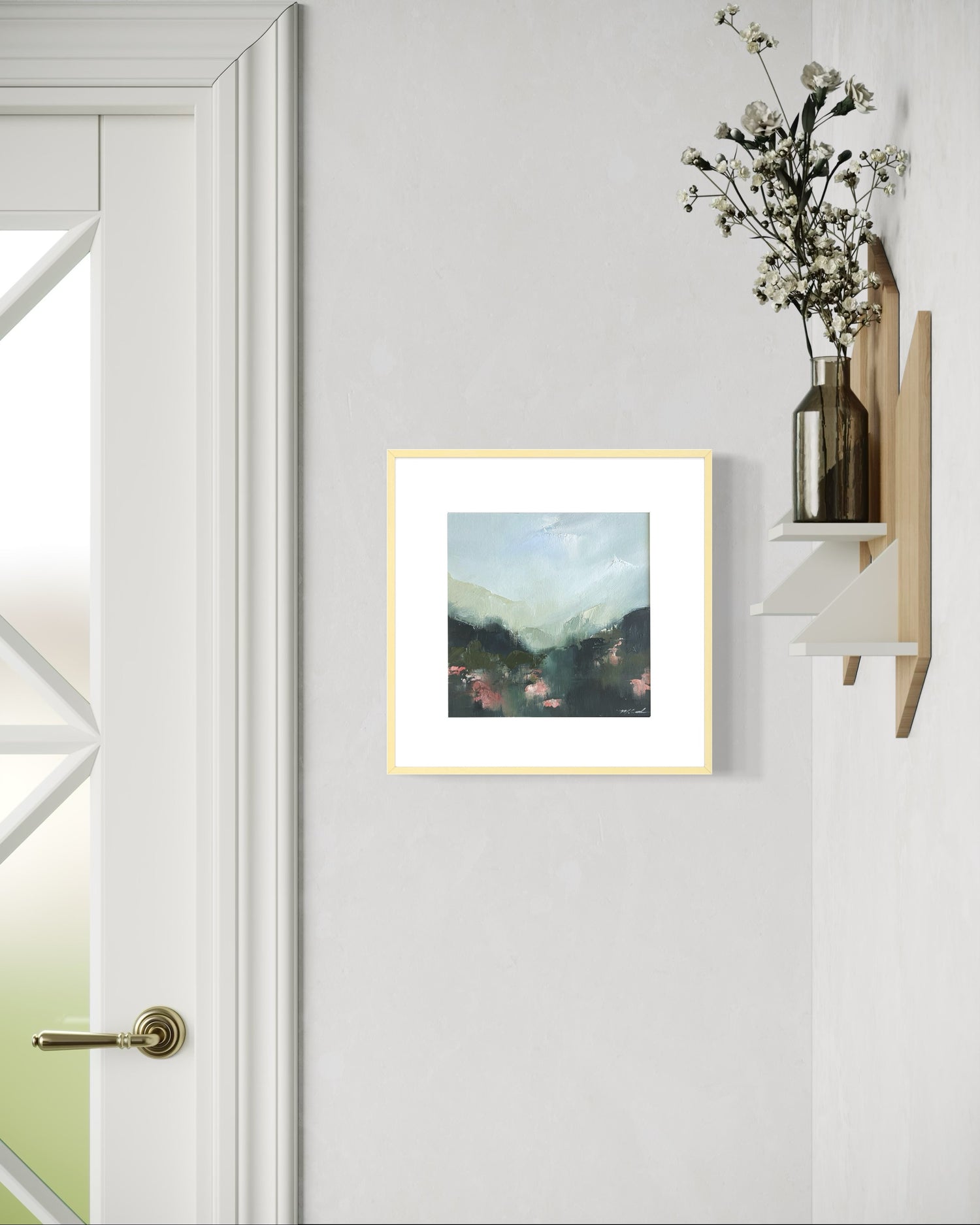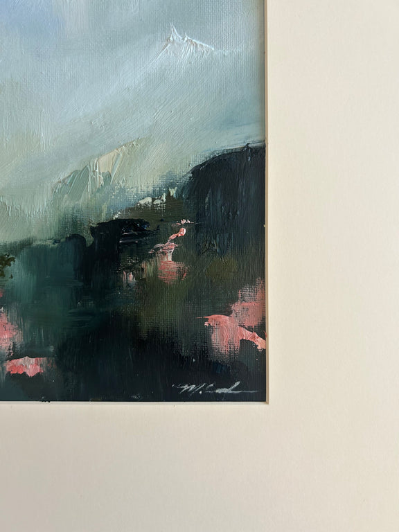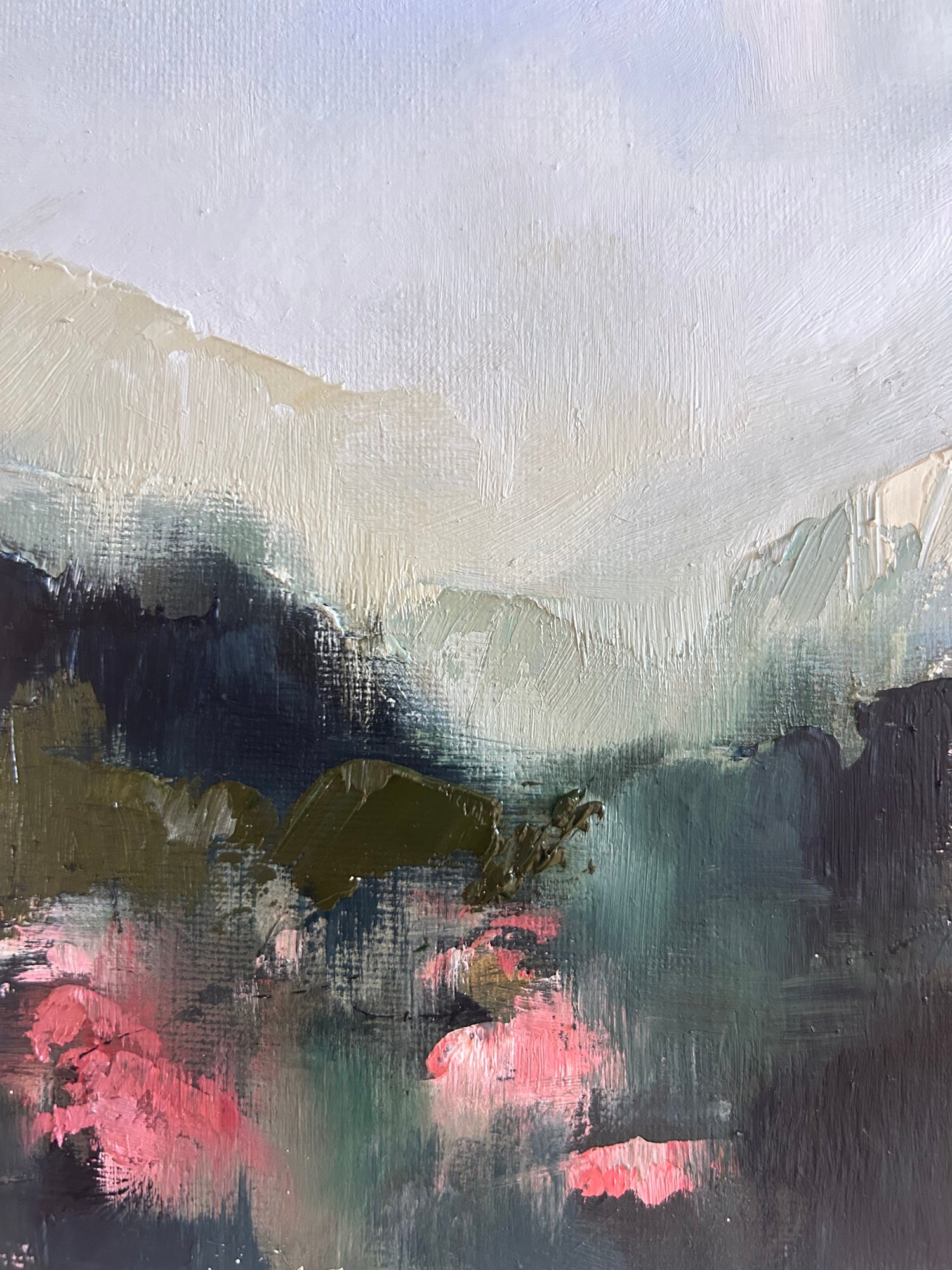 This 8x8" oil painting, framed and matted to 12x12,” captures the delicate beauty of pink blossoms standing strong against a backdrop of dark, rugged mountain terrain. The contrast of vibrant flowers against the deep greens reminds us that no matter how difficult the landscape may seem, there is always room for growth and new beginnings.