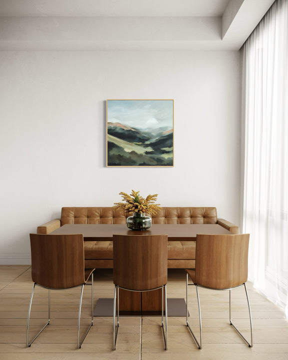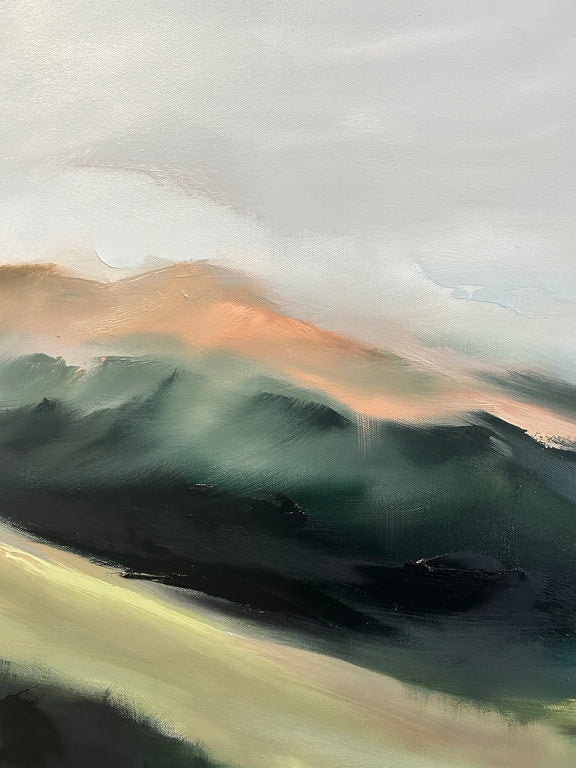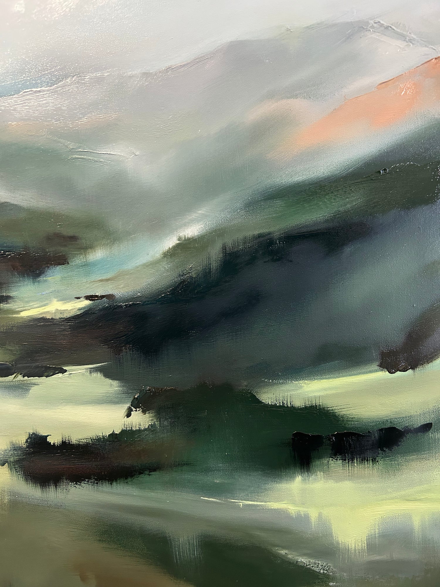 A 36x36" oil painting featuring a dynamic composition of lush greens, serene blue-gray skies, and an accent of warm terra cotta. It evokes a sense of sweeping energy and movement. The bold strokes and layered textures create a visual journey through a mint green valley, symbolizing the excitement and opportunity of new adventures on the horizon.