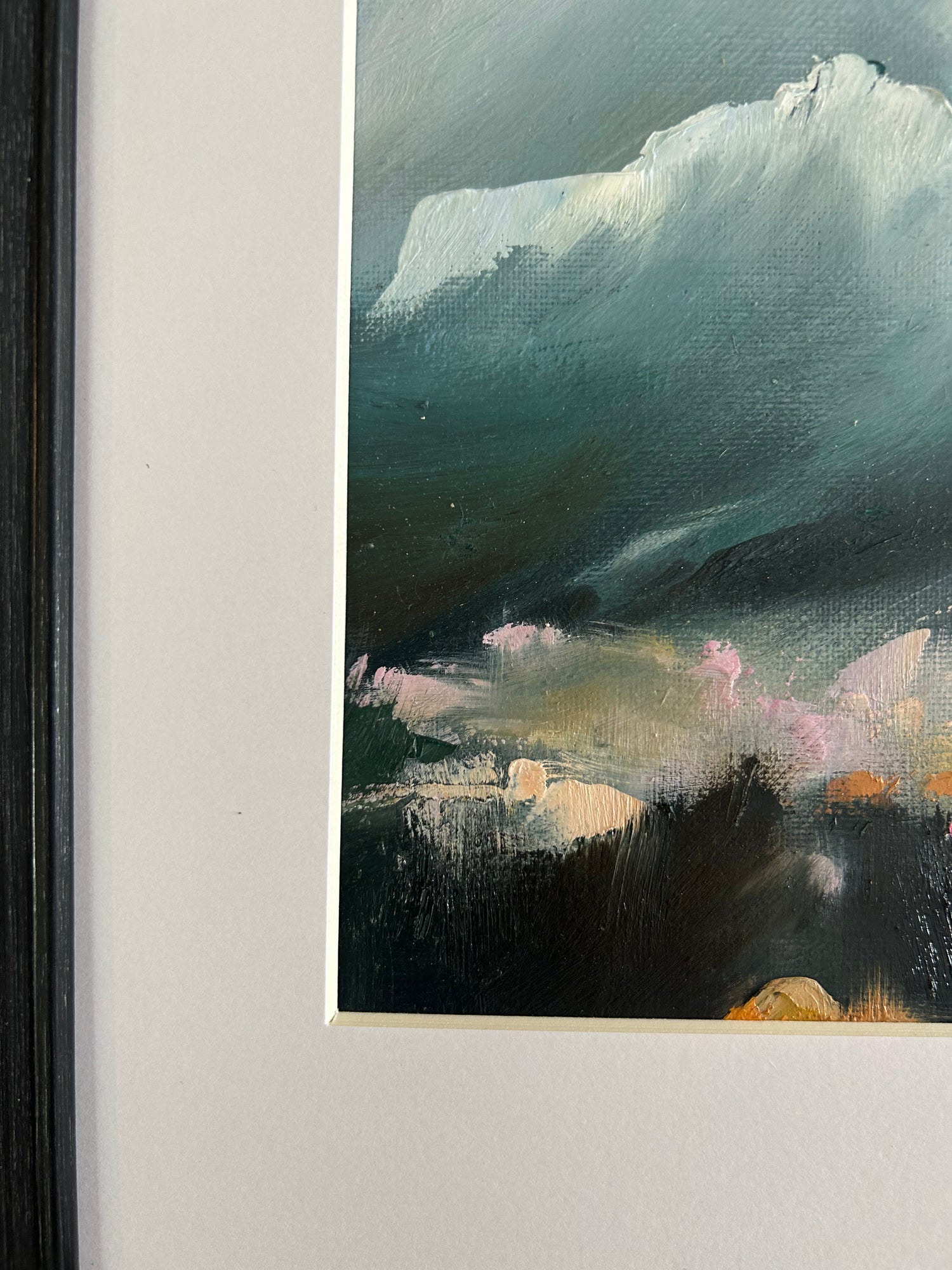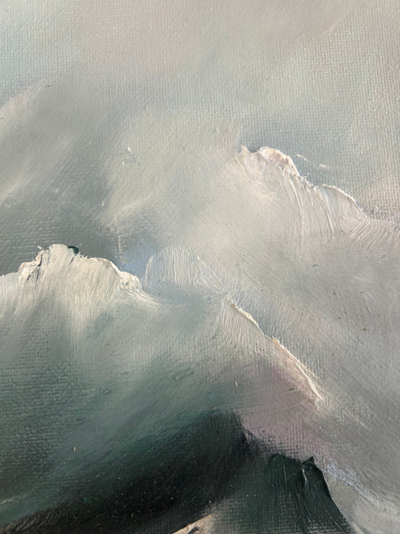 This 8x10 oil painting on canvas board features a palette cool whites, blues, and grays, accented with pops of pink, green, and yellow.