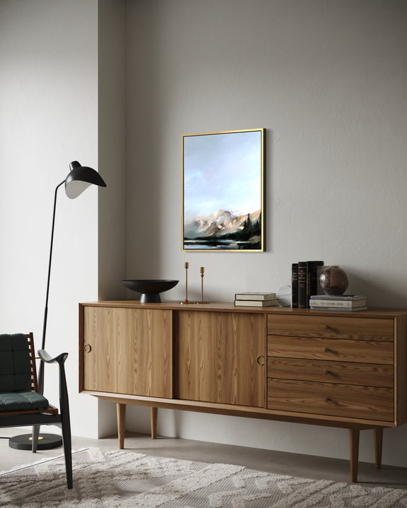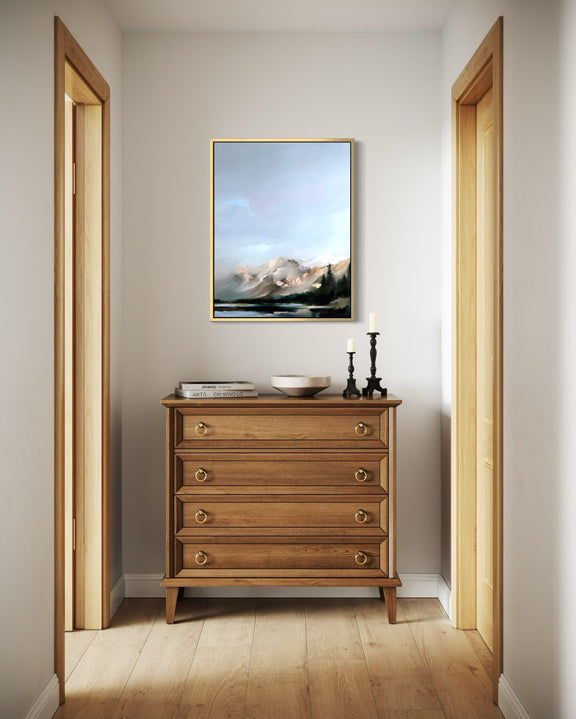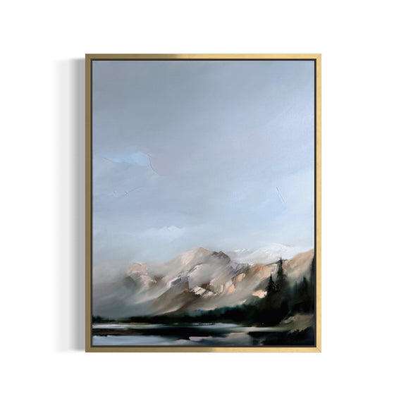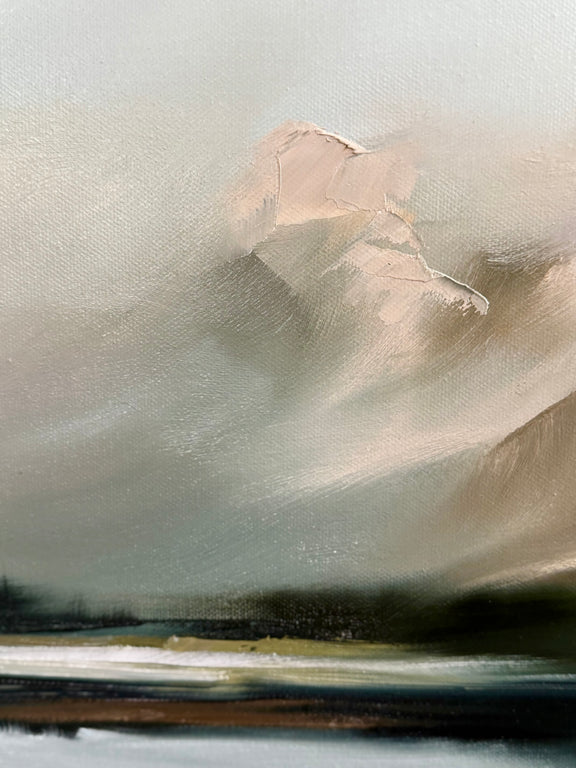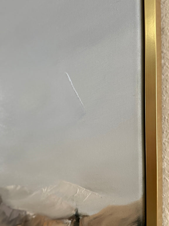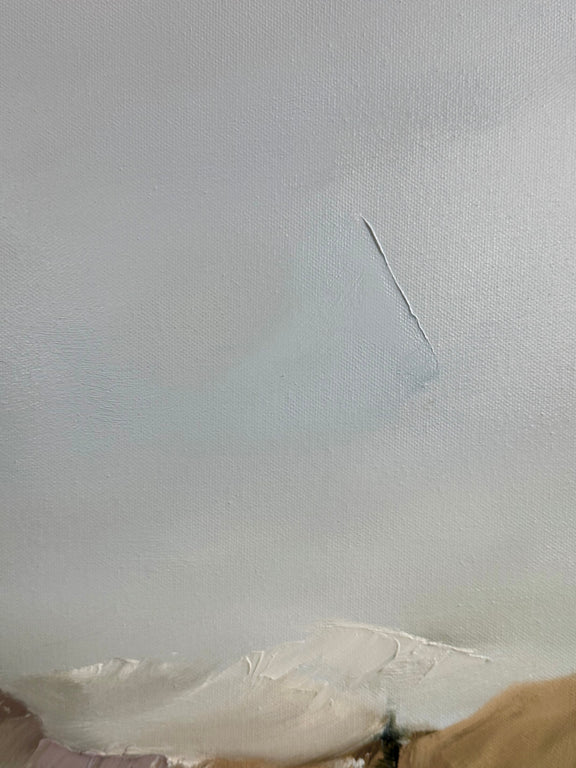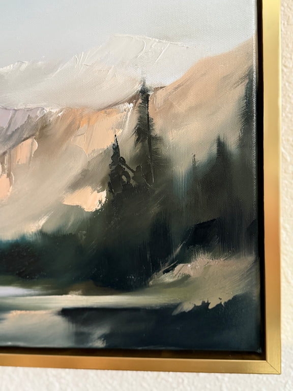 Bring calming colors, beautiful texture, and movement into your home with this 22x28" oil painting. Inspired by the open air of the Colorado mountain and its stark contrast to the thunderous mountains below. This piece features dramatic pallet-knife work, layered texture, and a dreamy color palette.