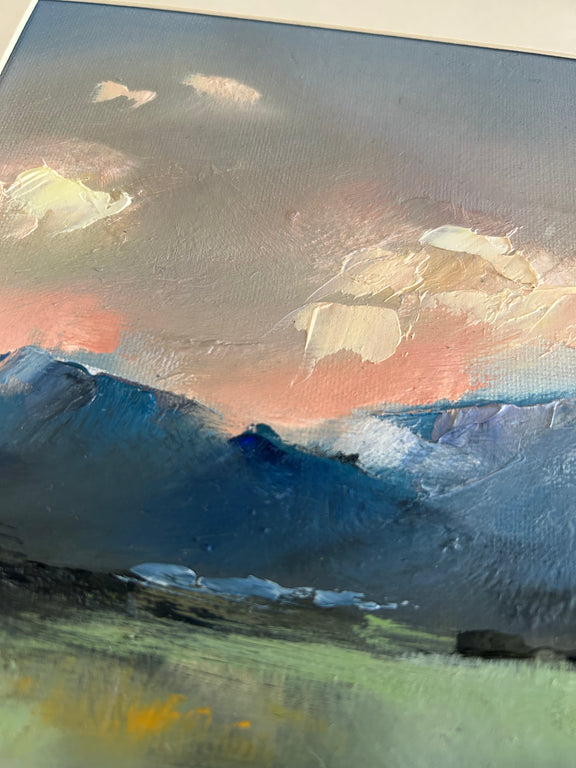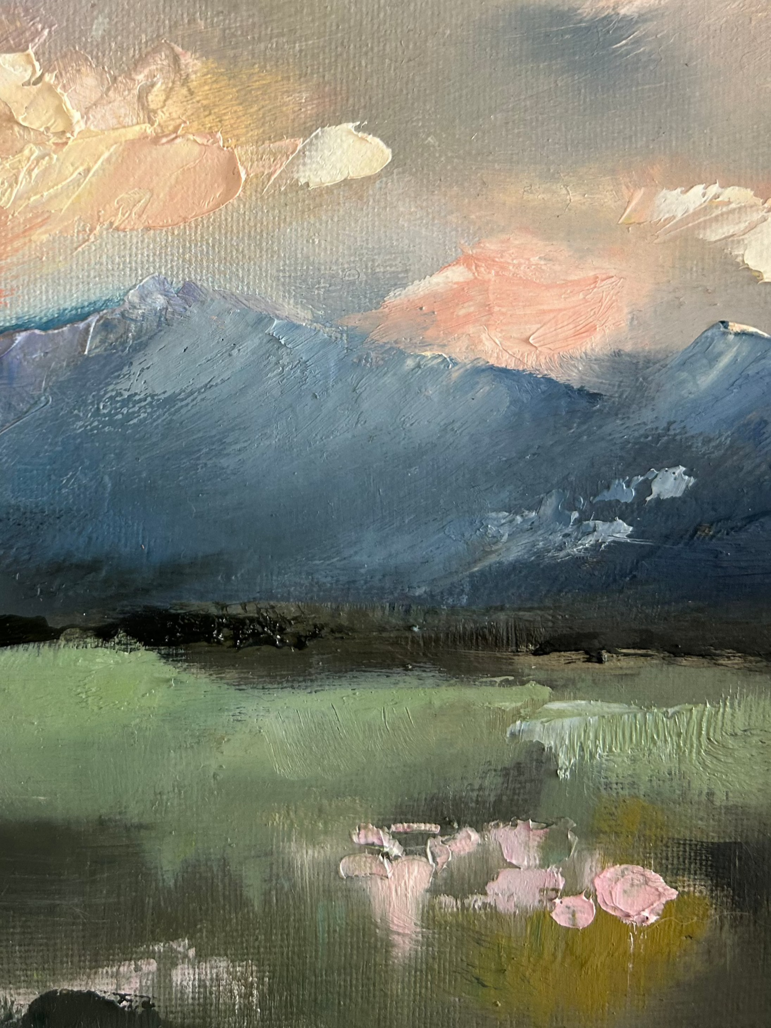 This 8x10 oil painting on canvas board features a palette of purple, green and blue with pops of pink, peach, and white.