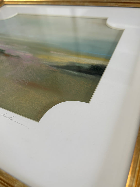 This 8x10 soft oil pastel on 160g rag paper. Features a pastel color palette. Framed in an 12x15 faux antique-gold frame.