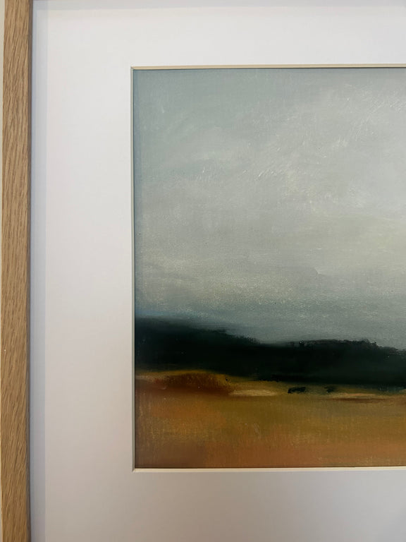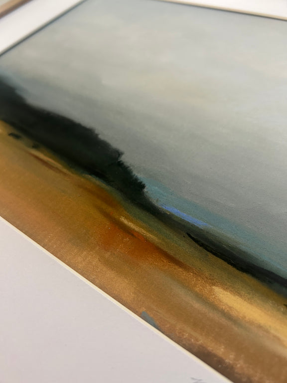 This 9x12 soft oil pastel on 100% cotton archival-quality sanded paper.  Features a fall color palette of tan, rust, brown, and blue. Framed in a 16.75x12.75 oak wood frame.