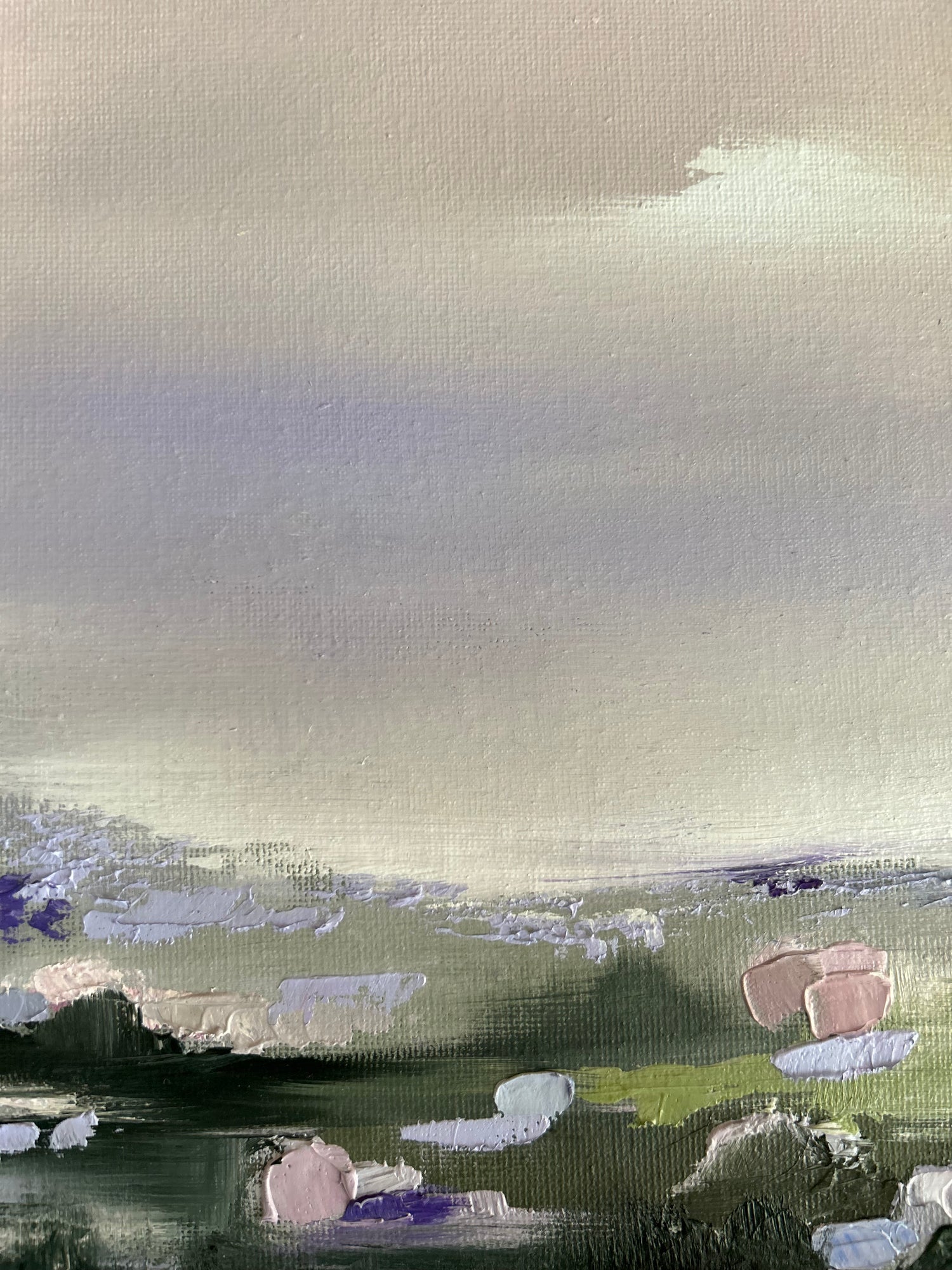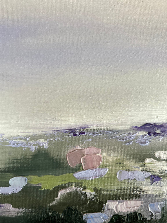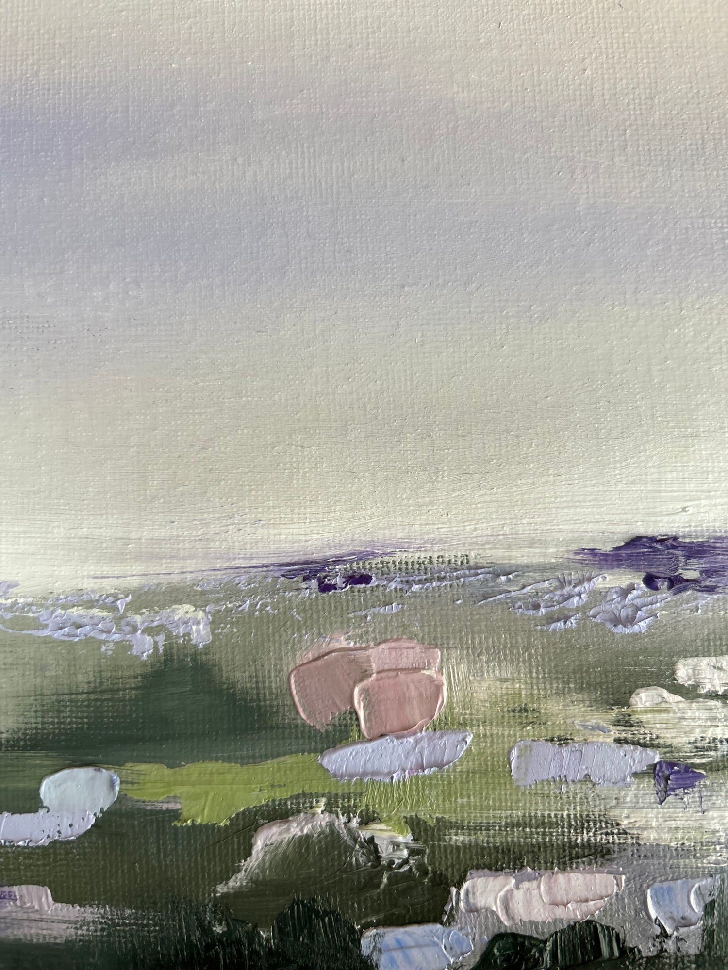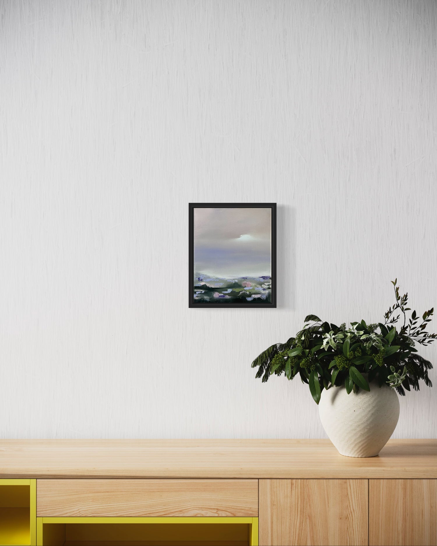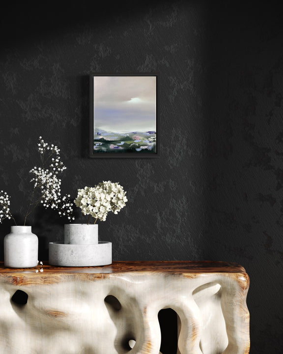 An 8x10 oil painting on a 3/4" deep gallery-wrapped cotton canvas. A dreamy combination of dark and light purples with soft pinks, ice blues and several tones of green. Set in a black float frame. Features small amounts of texture.