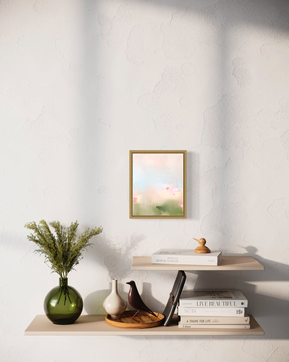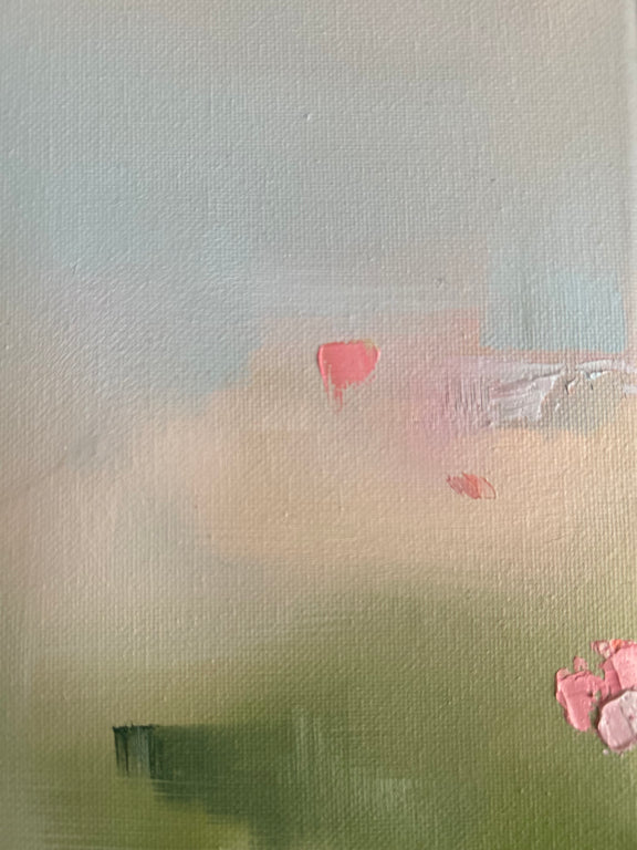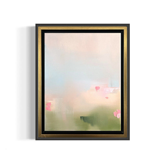 An 8x10 oil painting on a 3/4" deep gallery-wrapped cotton canvas. The most abstract piece in the "Mini Wildflower Series," this piece features angular strokes of green and subtle petal-like strokes of paint. Set in an antique gold-style float frame.