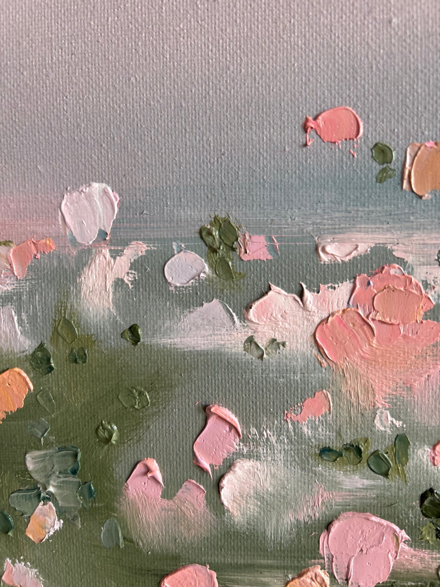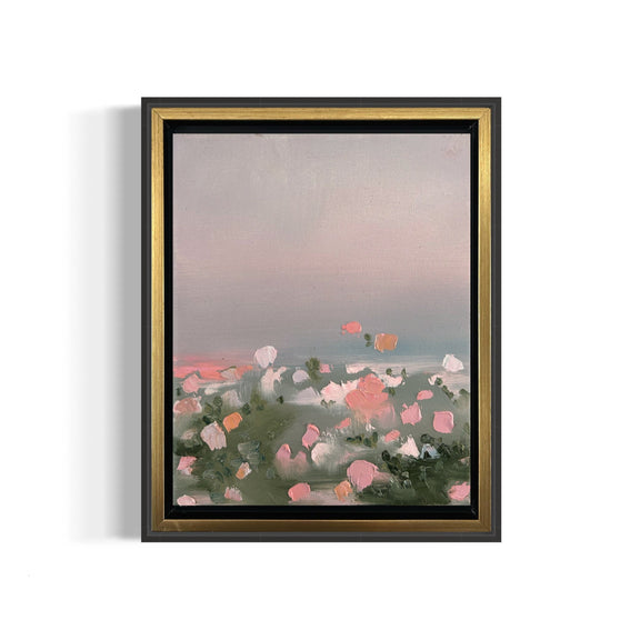 An 8x10 oil painting on a 3/4" deep gallery-wrapped cotton canvas. Set in an antique gold-style float frame. Features heavy amounts of texture.