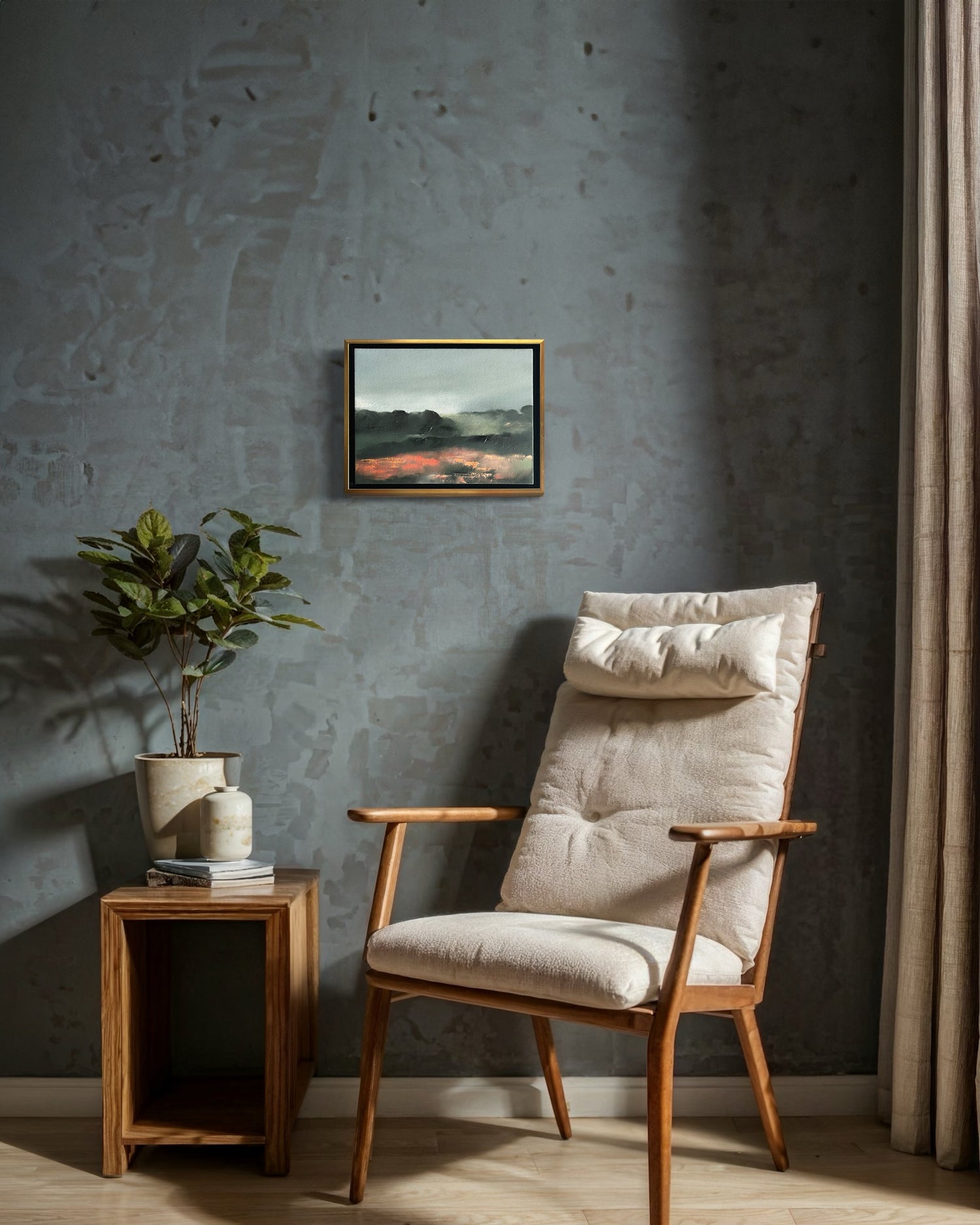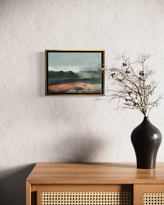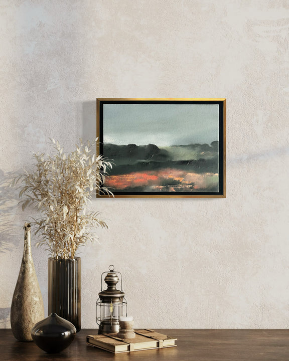 Bring home this intimately-sized yet dramatic artwork and experience the allure of a fog-kissed meadow adorned with red and peach wild blooms.