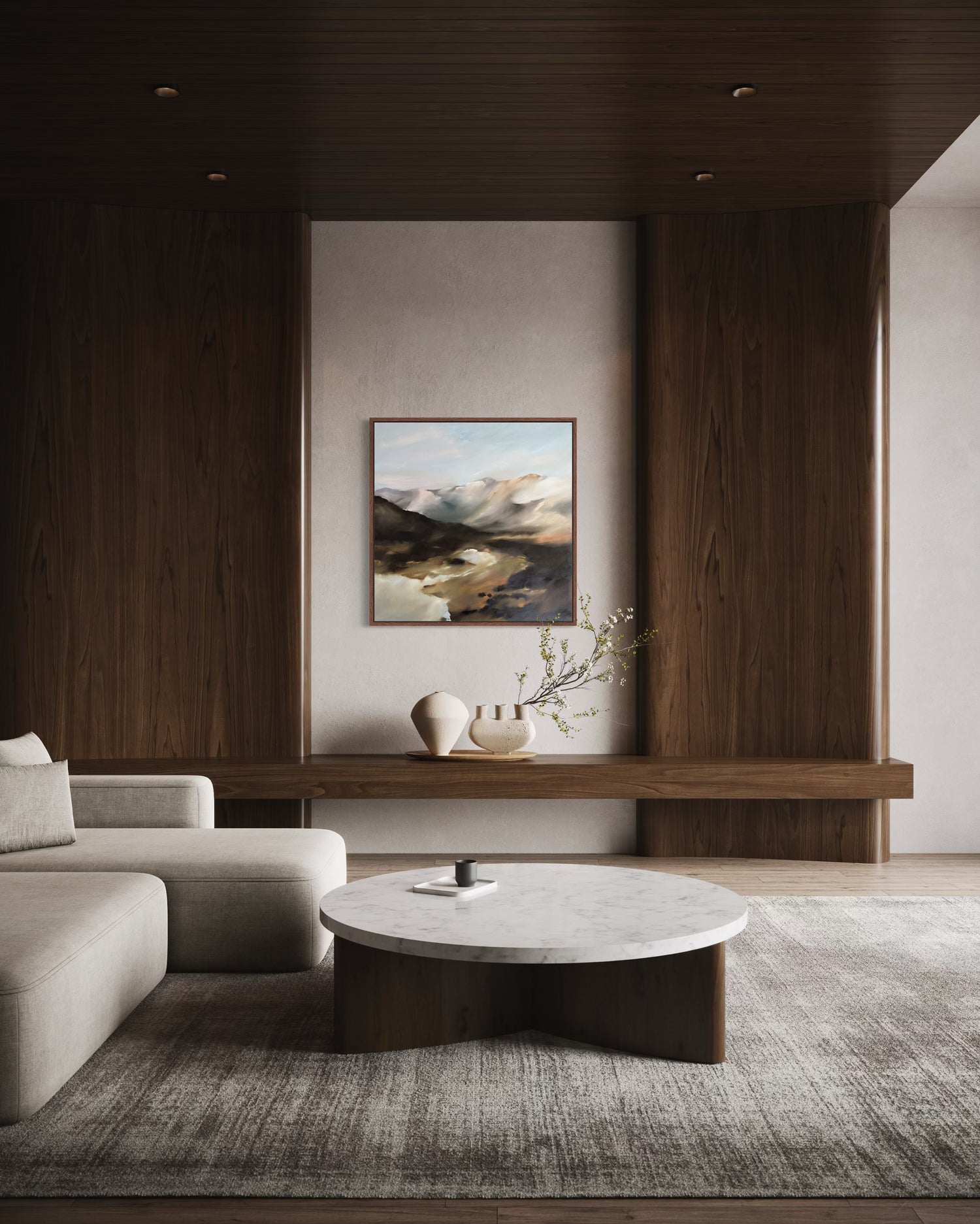 A 36x36" impressionist mountainscape, painted in rich browns and cool ice blues. Soft white and warm ochre accents illuminate the rugged terrain, while an icy blue river winds through the canyon, guiding the eye across the expansive view. Textured brushwork and layered earth tones evoke the quiet power of nature—perfect for creating a grounded, serene focal point in any space.