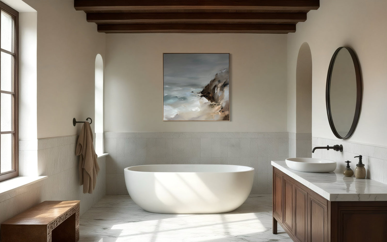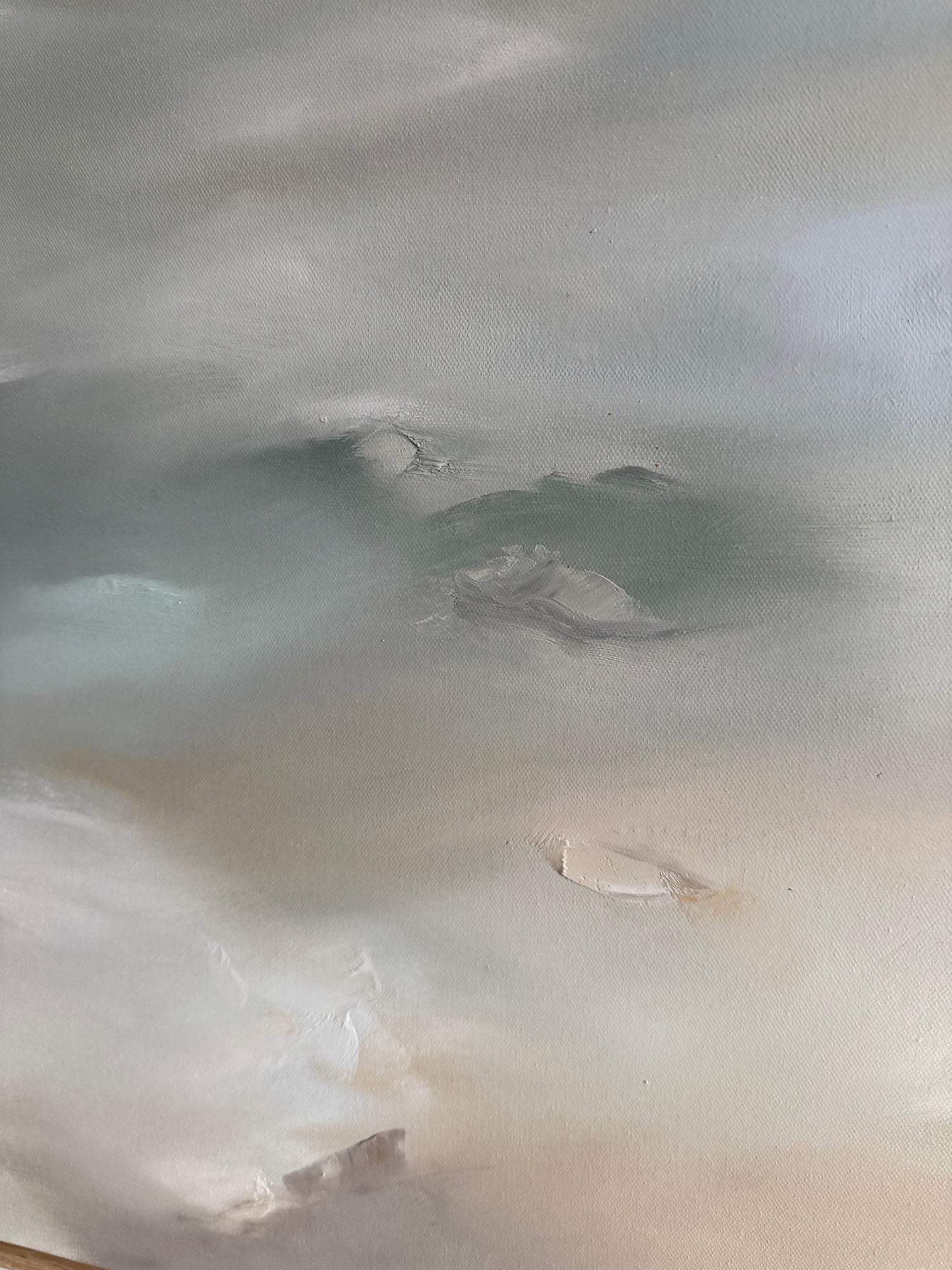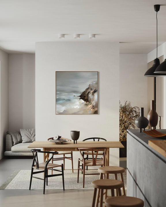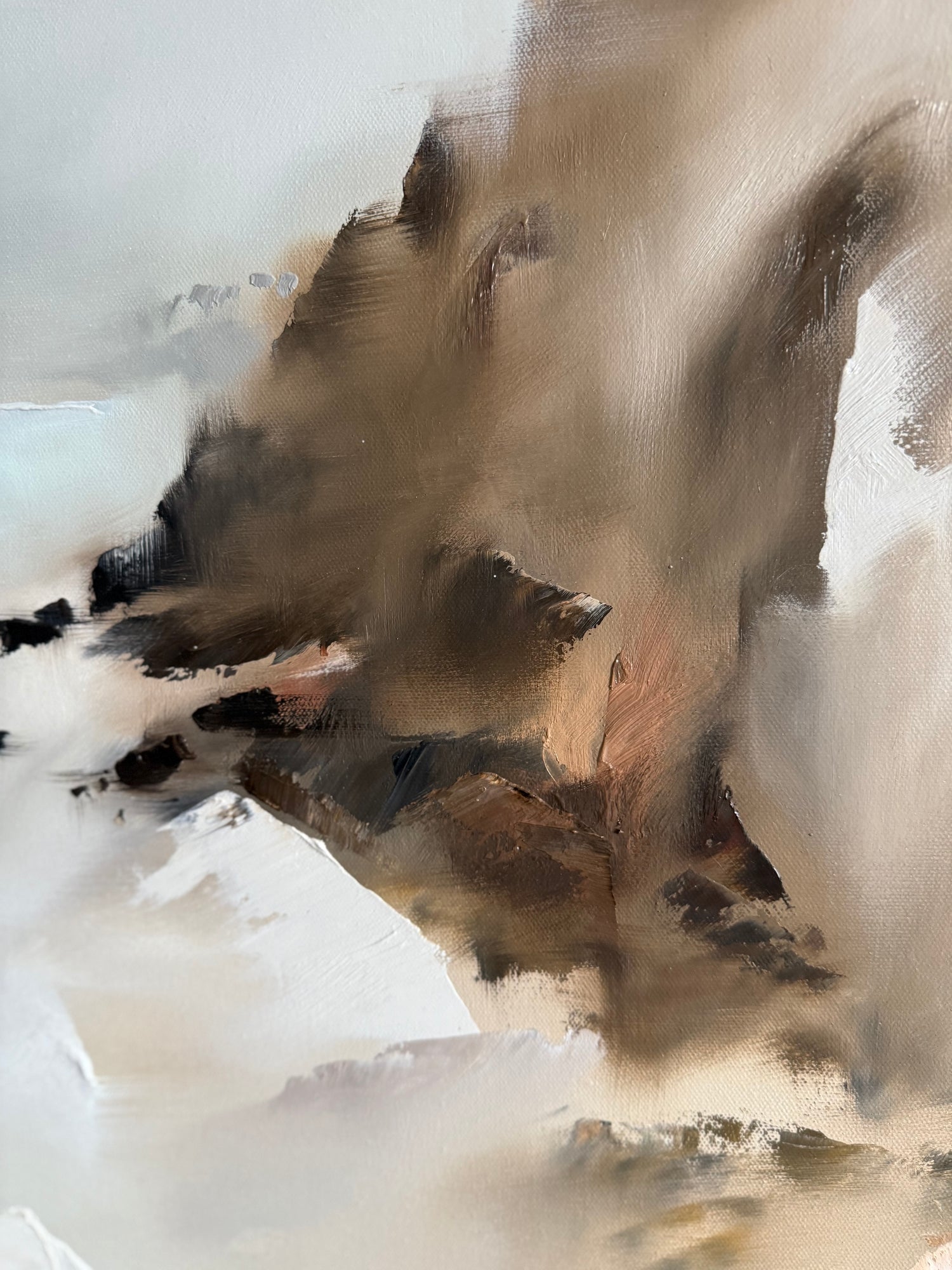 A 36x36" oil painting inspired by the rocky coastline. Textured layers in sandy neutrals, soft blues, and stone tones reflect the movement of waves against the rocky shore.