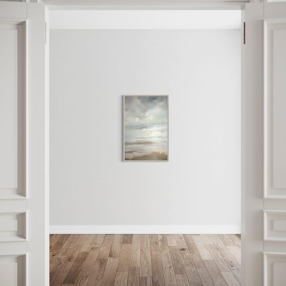 An abstract coastal oil painting featuring minimal amounts of texture. Painted on a 1.5" deep gallery-wrapped cotton canvas. Faux walnut wood float frame included. Hand-signed by the artist.