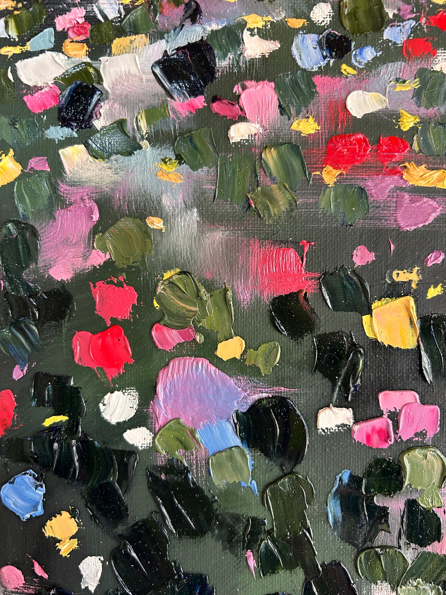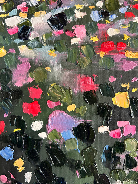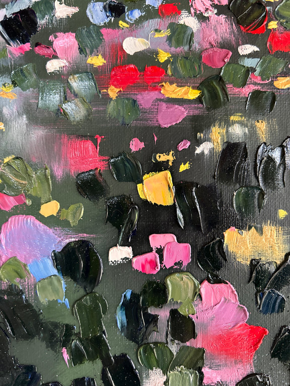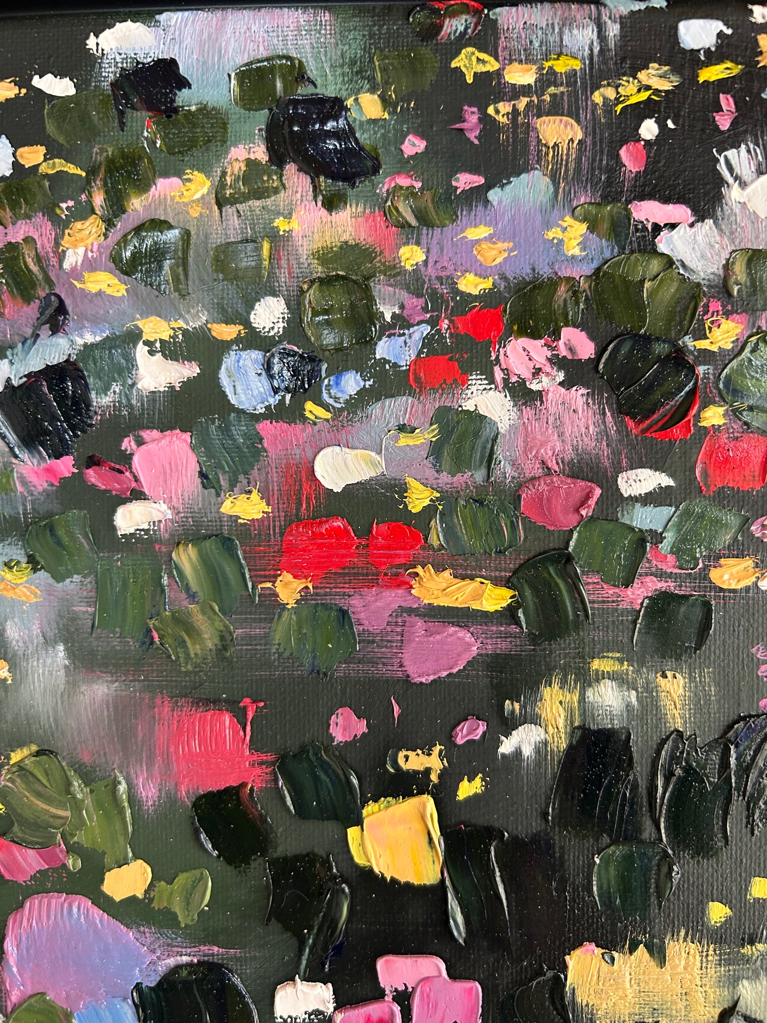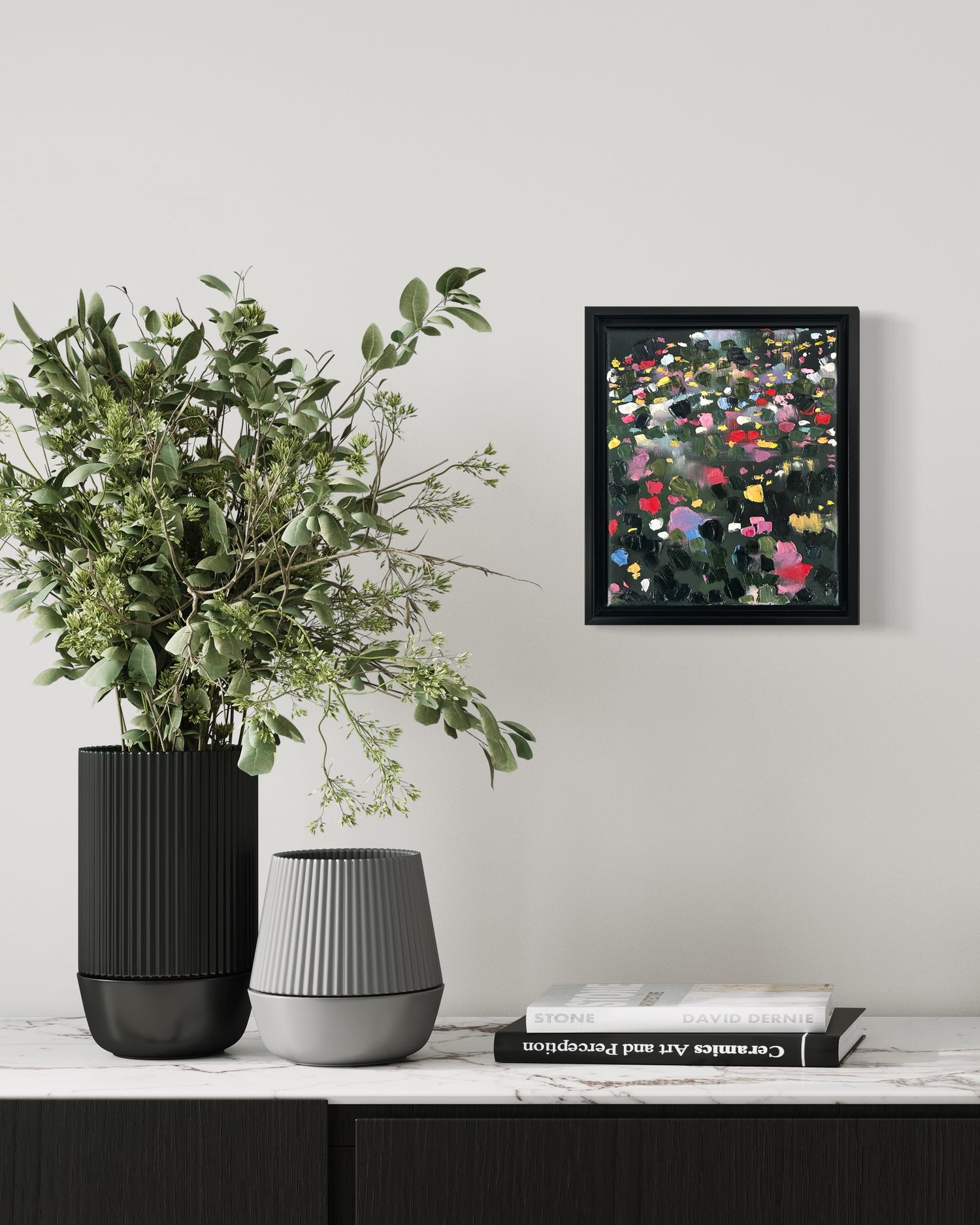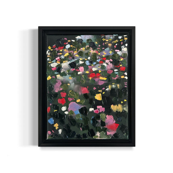 An 8x10 oil painting on a 3/4" deep gallery-wrapped cotton canvas. Set in a black float frame. Features heavy amounts of texture. Ships free within the U.S.