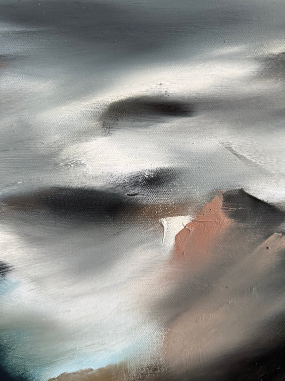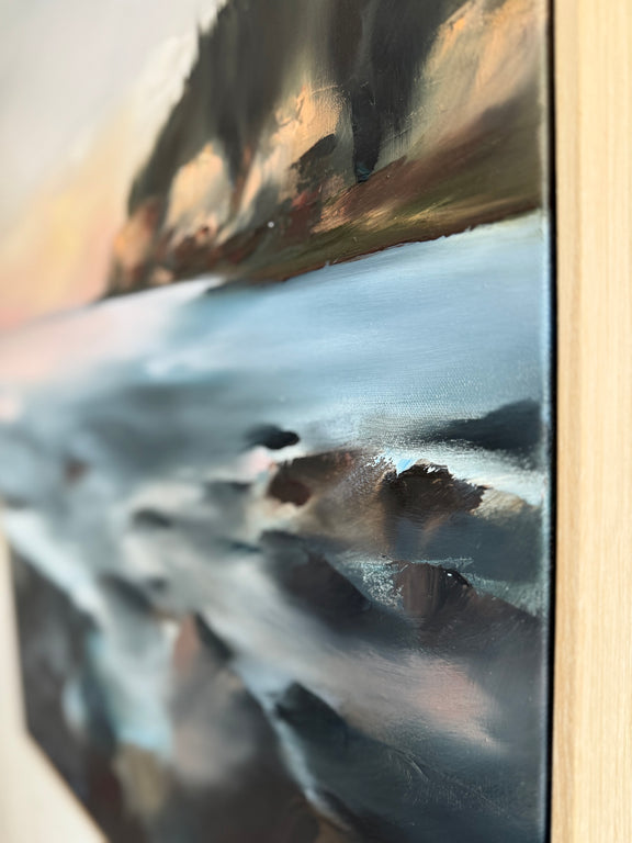 A 24x30" oil painting inspired by the Acadia coastline and a photograph by Freddy Bloy. Soft pastels meet dark, weathered rocks, while textured palette knife strokes capture Maine pine trees and the wave-worn shoreline, bringing the rugged beauty of the coast vividly to life. Inspired by the beautiful photography of Frederick Bloy.